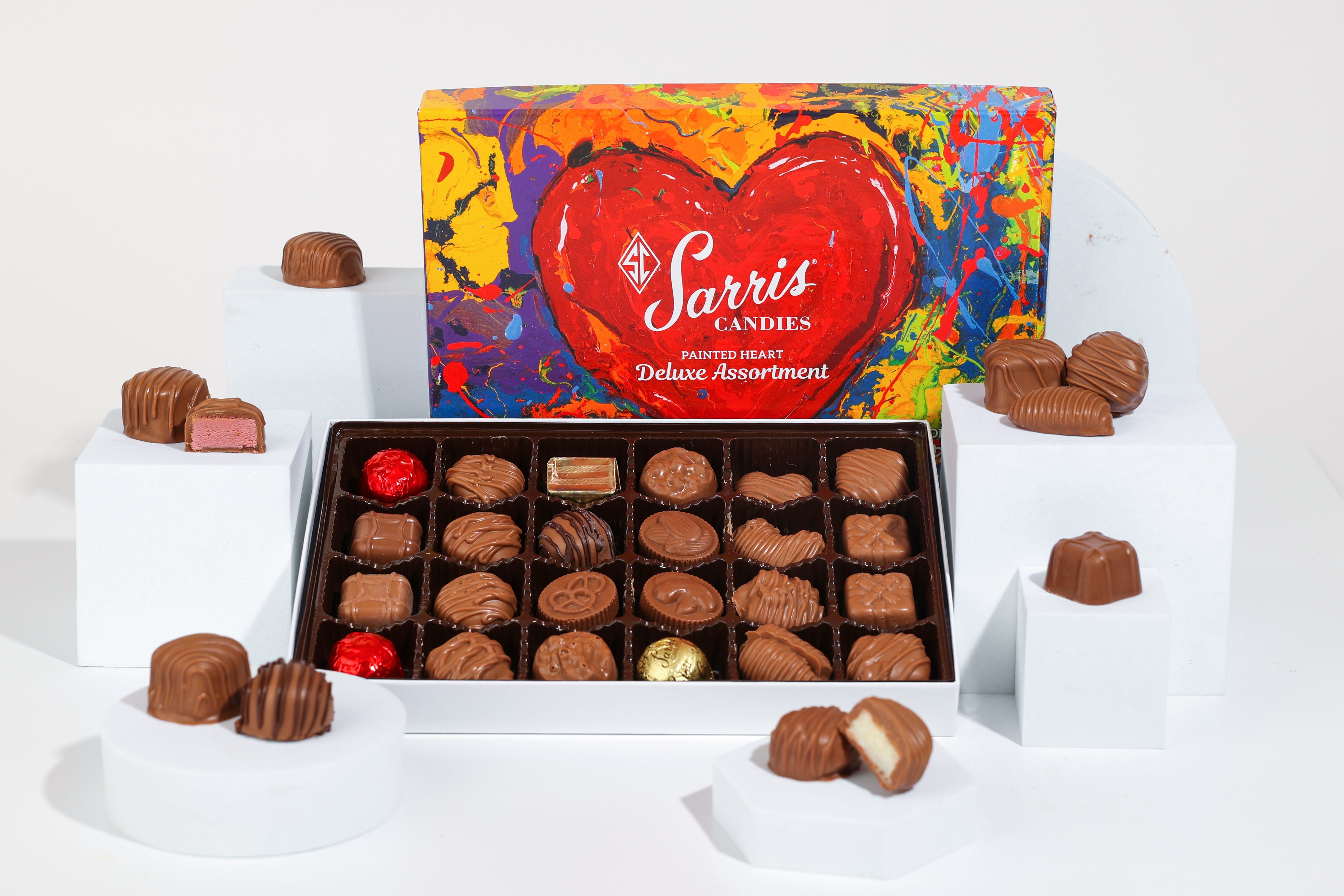 Save on a selection of her faves! Enjoy an assortment of our most popular pieces including roasted nuts, caramels, meltaways, cherries, and more inside of a colorful heart-themed box featuring artwork from local artist, Johno Prascak.