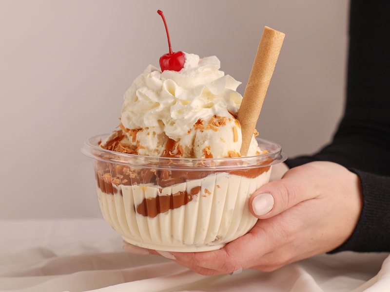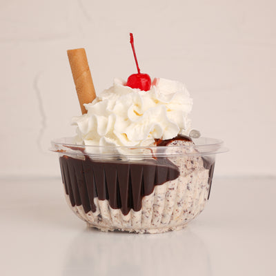 One scoop of ice cream with one topping. Finished with whipped cream, cherry and a signature cookie stick.