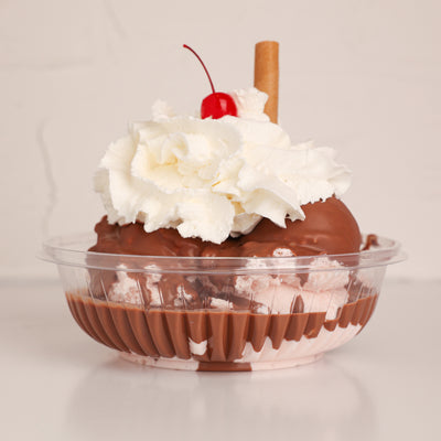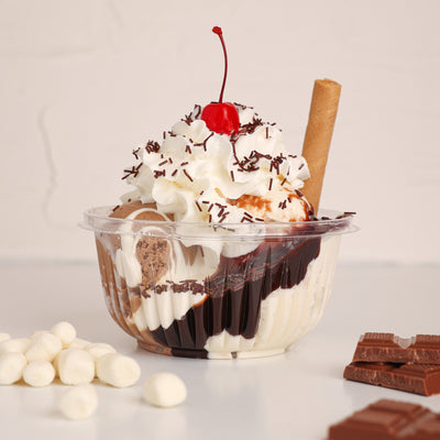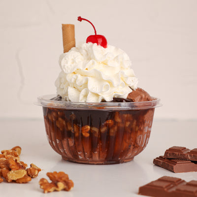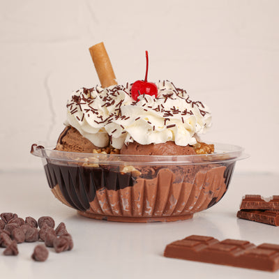 One scoop each of chocolate, chocolate chip and double chocolate ice cream with hot fudge, your choice of fresh roasted nuts and chocolate sprinkles.