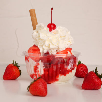 Two scoops of vanilla ice cream, strawberry topping, and chocolate jimmies. Available through Friday, October 31st.