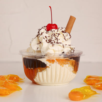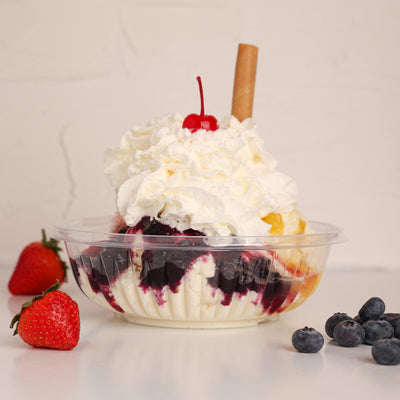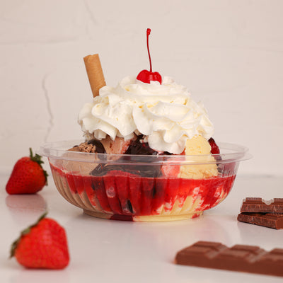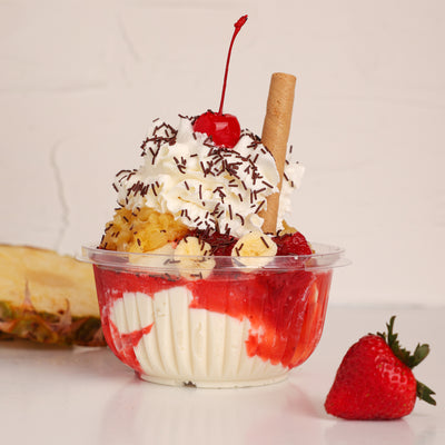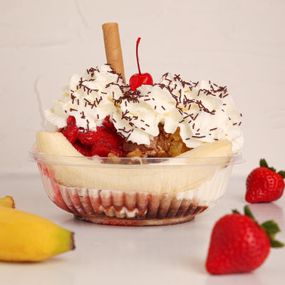 Fresh banana with one scoop each of vanilla, chocolate, and strawberry ice cream, topped with chocolate sauce, strawberry topping, crushed pineapple, maple walnuts and chocolate sprinkles.