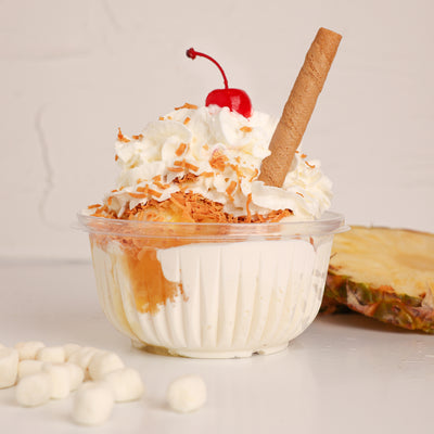 Two scoops of vanilla ice cream with crushed pineapple, marshmallow topping and toasted coconut.