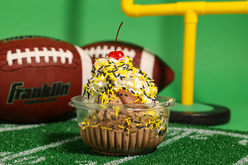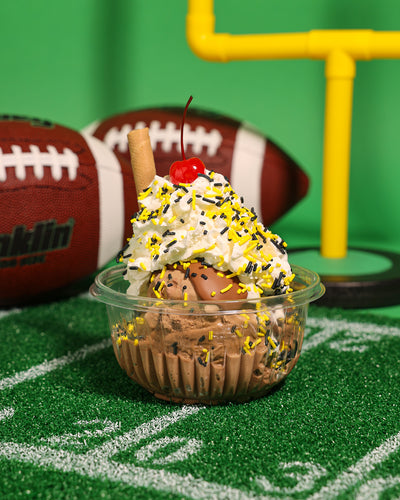 Two scoops of double chocolate ice cream, Peanut Butter Hard Cap, and black & gold jimmies.